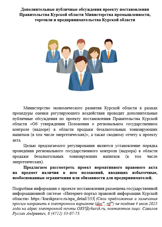 НаименованиеПроект постановления Правительства Курской области "Об утверждении Положения о региональном государственном контроле (надзоре) в области продажи безалкогольных тонизирующих напитков (в том числе энергетических)"