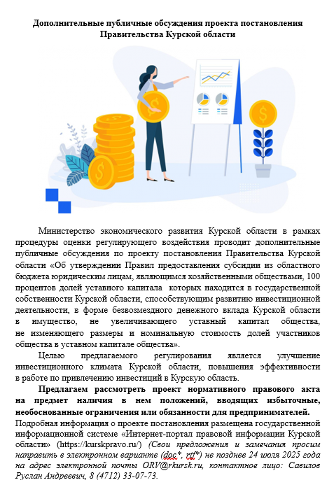 Проект постановления Правительства Курской области «Об утверждении Правил предоставления субсидии из областного бюджета юридическим лицам, являющимся хозяйственными обществами, 100 процентов долей уставного капитала которых находится в государственной собственности Курской области, способствующим развитию инвестиционной деятельности, в форме безвозмездного денежного вклада Курской области в имущество, не увеличивающего уставный капитал общества, не изменяющего размеры и номинальную стоимость долей участников общества в уставном капитале общества»