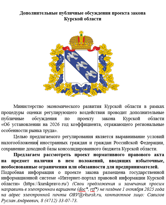 Комментарий<p class="ql-align-justify"> В целях экономического регулирования вопросов привлечения и использования трудящихся-мигрантов, проектом закона Курской области «Об установлении на 2026 год коэффициента, отражающего региональные особенности рынка труда» предлагается установить на 2026 год региональный коэффициент равный 3,07.</p><p><br></p>