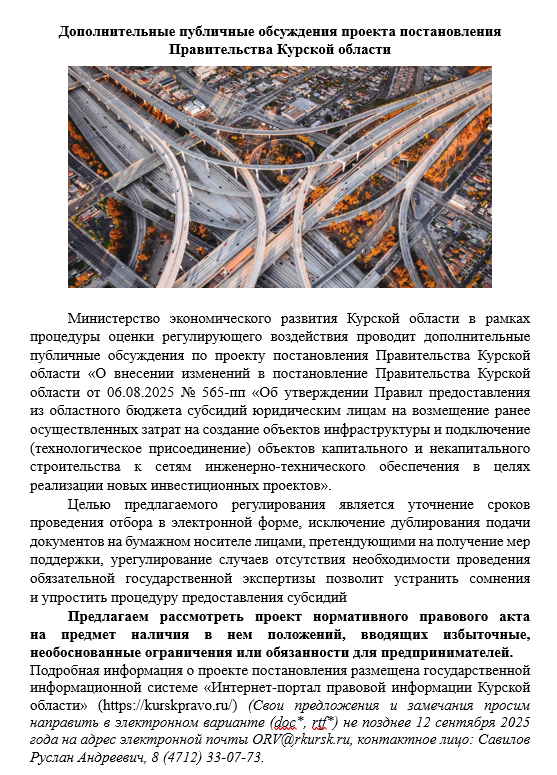 НаименованиеО внесении изменений в постановление Правительства Курской области от 06.08.2025 № 565-пп «Об утверждении Правил предоставления из областного бюджета субсидий юридическим лицам на возмещение ранее осуществленных затрат на создание объектов инфраструктуры и подключение (технологическое присоединение) объектов капитального и некапитального строительства к сетям инженерно-технического обеспечения в целях реализации новых инвестиционных проектов»