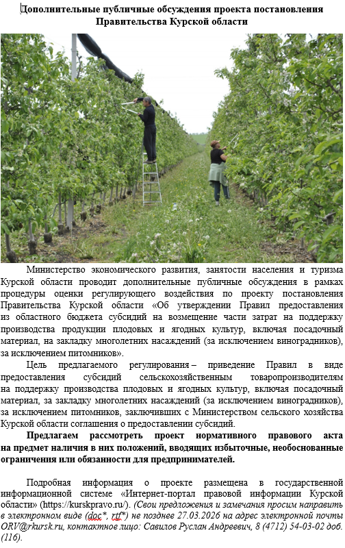 Проект постановления Правительства Курской области «Об утверждении Правил предоставления из областного бюджета субсидий на возмещение части затрат на поддержку производства продукции плодовых и ягодных культур, включая посадочный материал, на закладку многолетних насаждений (за исключением виноградников)»